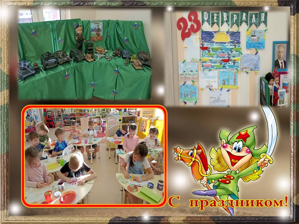 В преддверии праздника в нашей группе прошла тематическая неделя «Наша армия», в течение которой дети знакомились с традициями праздника. На занятиях, полученные знания дети воплотили в своих рисунках, аппликациях, и конечно в изготовлении подарков для своих пап. С большим интересом девочки в совместной работе с воспитателями оформили стенгазету для мальчиков.